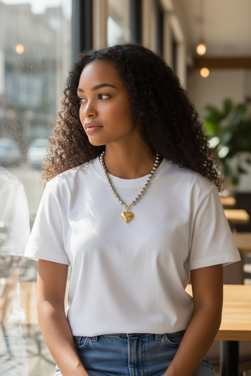 Whether you’re dressing up for brunch or adding a hint of shine to your everyday look, this silver and gold heart chain necklace is a timeless essential that never goes out of style.