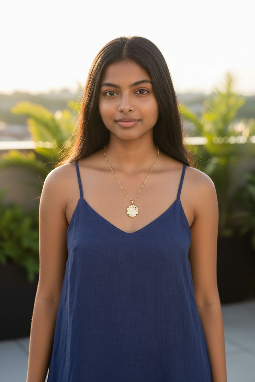 At the heart of this pendant lies a single word: Rani—engraved on a smooth golden canvas, a quiet declaration of strength and grace. Around it, the edges are left raw, alive with texture, holding the nine divine colors that once adorned queens and goddesses.
